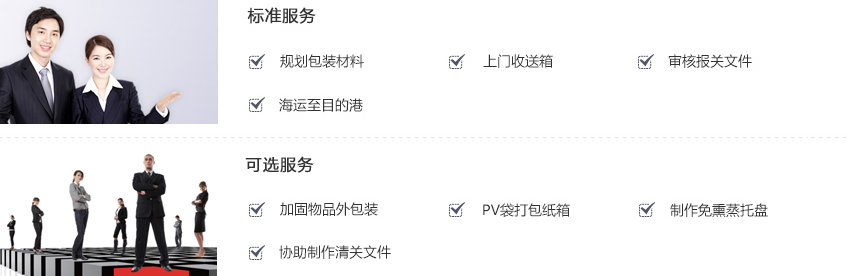 將所有物品進(jìn)行包裝或上門取件至我司倉庫,PV帶打包紙箱并制作免熏蒸托盤,報關(guān)后海運至您指定的目的港,您需自行安排清關(guān)并繳納目的港港口費用后提貨。